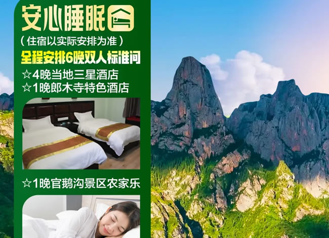 3、住宿:全程5晚商務(wù)型雙人標(biāo)準(zhǔn)間+1晚官鵝溝景區(qū)為農(nóng)家樂。(以實際安排為準(zhǔn))