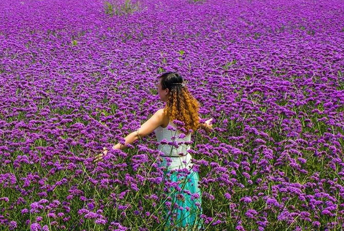 馬鞭花景區(qū),近百畝馬鞭草花田里,鮮花盛開。遠(yuǎn)遠(yuǎn)望去,如同為綠色大地鋪上一層紫色的地毯。微風(fēng)拂動下,紫色的馬鞭草愈發(fā)動人,吸引了不少游客前來拍照留影。